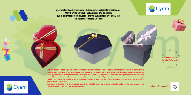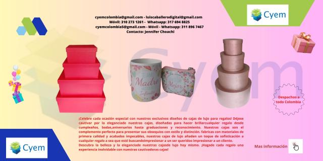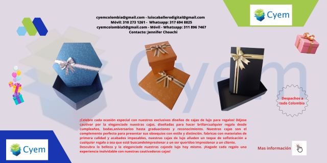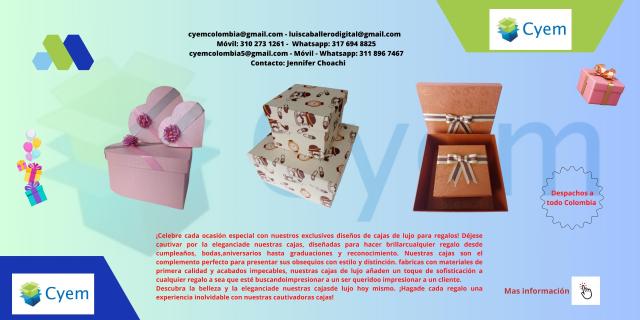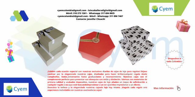 ¡Celebre cada ocasión especial con nuestros exclusivos diseños de cajas de lujo para regalos! Déjese cautivar por la elegancia de nuestras cajas, diseñadas, para hacer brillar cualquier regalo desde cumpleaños, bodas, aniversarios, hasta graduaciones y reconocimiento. Nuestras cajas son el complemento perfecto para presentar sus obsequios con estilo y distinción. fabricadas con materiales de primera calidad y acabados impecables, nuestras cajas de lujo añaden, un toque de sofisticación a cualquier regalo ya sea que esté buscando impresionar a un ser querido o impresionar a un cliente.